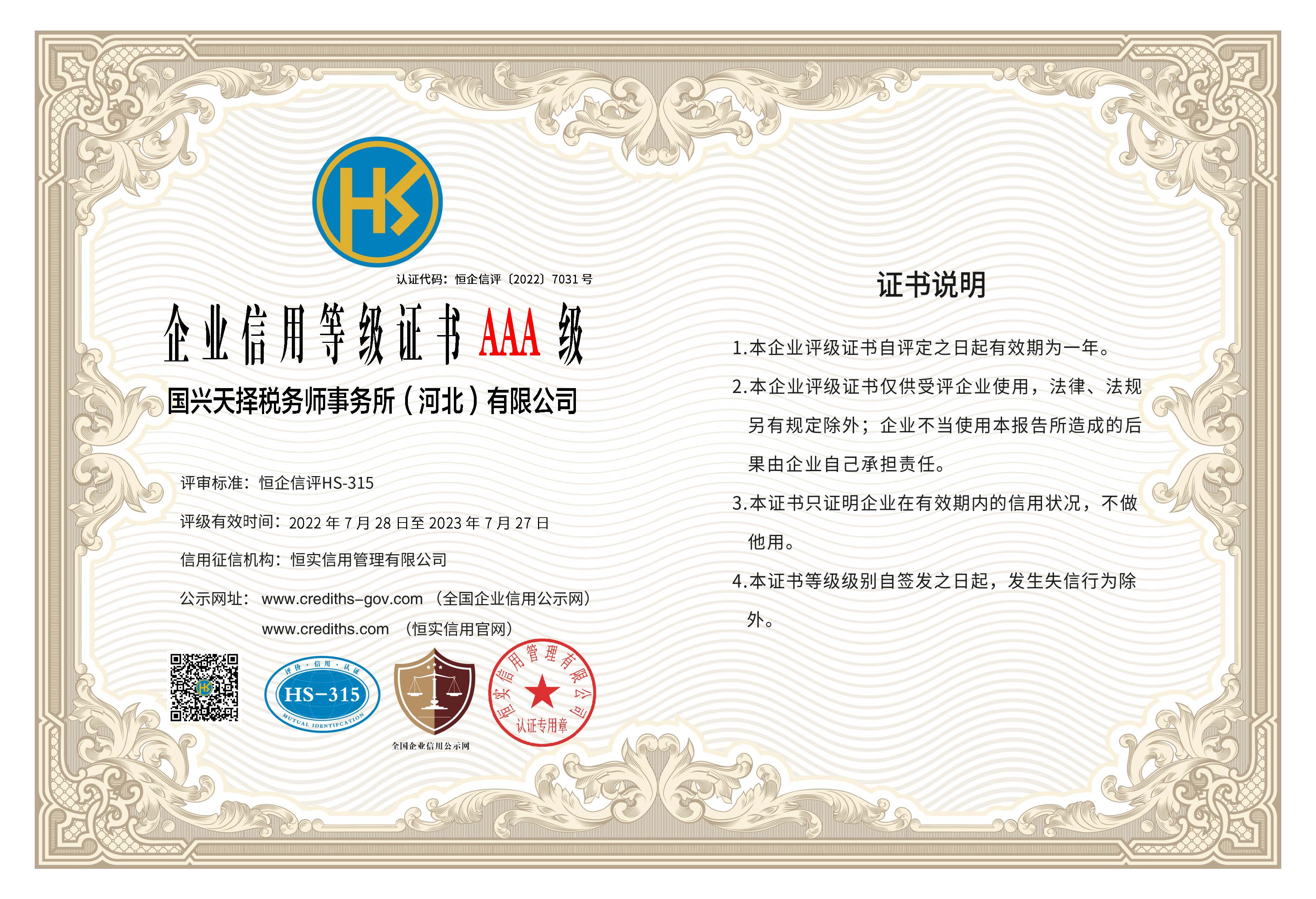 2022年7月,國(guó)興天擇稅務(wù)師事務(wù)所(河北)有限公司順利取得了“AAA級(jí)企業(yè)信用等級(jí)證書(shū)”。這標(biāo)志著我司在規(guī)范運(yùn)營(yíng)、誠(chéng)信經(jīng)營(yíng)上得到了相關(guān)部門及權(quán)威機(jī)構(gòu)的認(rèn)可。
