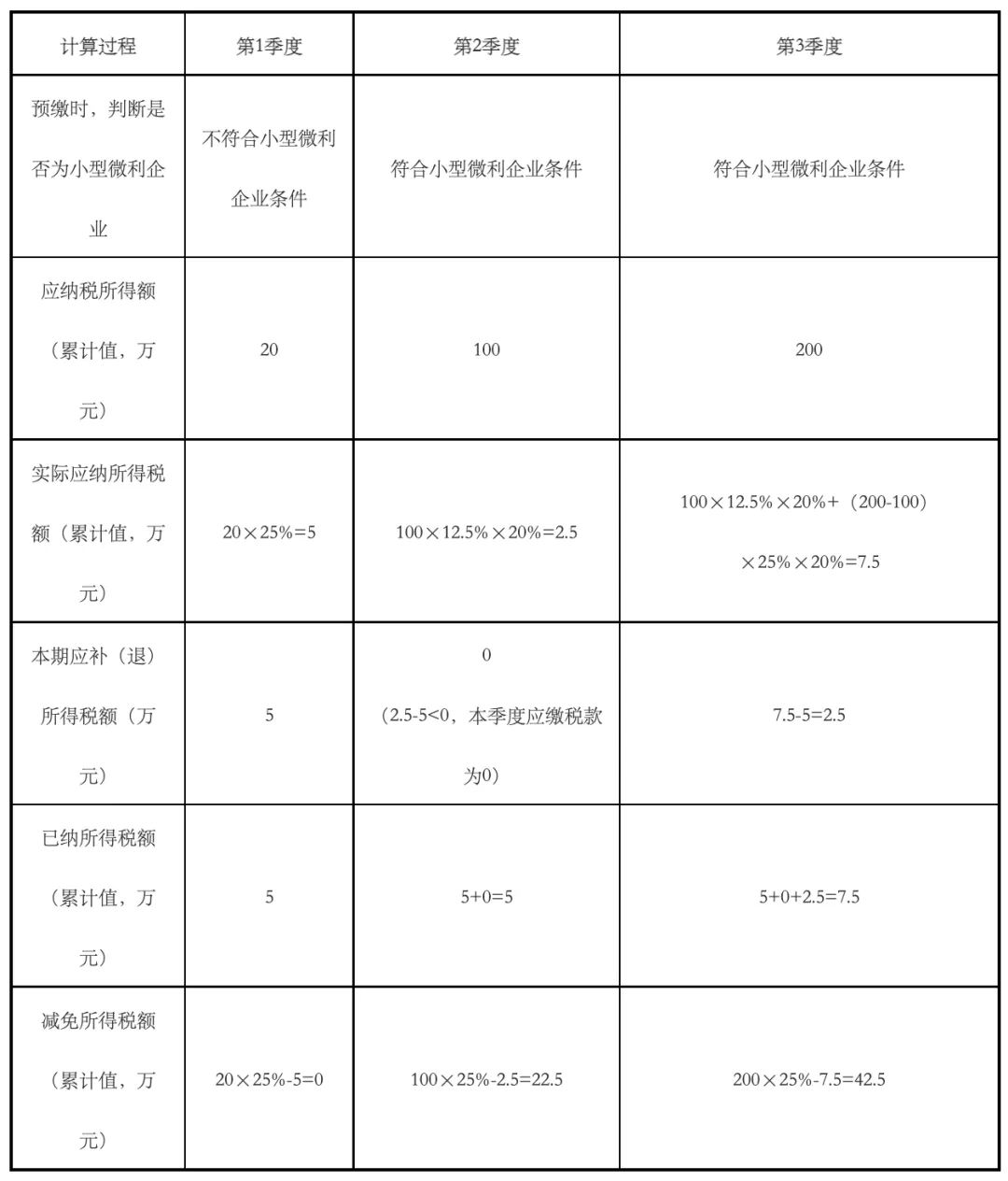 目前,小型微利企業(yè)的判斷標準為:從事國家非限制和禁止行業(yè),且同時符合截至本期末的資產(chǎn)總額季度平均值不超過5000萬元、從業(yè)人數(shù)季度平均值不超過300人、應納稅所得額不超過300萬元。今后如調(diào)整標準,從其規(guī)定,計算方法以此類推。示例如下: