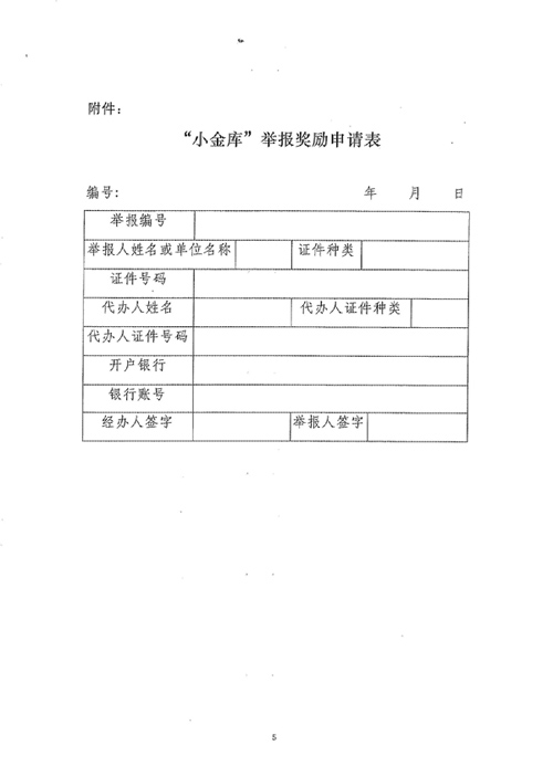 第八條 “小金庫(kù)”治理日常工作機(jī)構(gòu)根據(jù)舉報(bào)及查處情況,確定有功舉報(bào)人后,通知舉報(bào)人到指定地點(diǎn)辦理申請(qǐng)獎(jiǎng)勵(lì)手續(xù),查驗(yàn)舉報(bào)人身份證件或單位證明文件的原件,并留存復(fù)印件。登記用于領(lǐng)取獎(jiǎng)勵(lì)資金的銀行賬戶,填寫《舉報(bào)“小金庫(kù)”獎(jiǎng)勵(lì)申請(qǐng)表》。